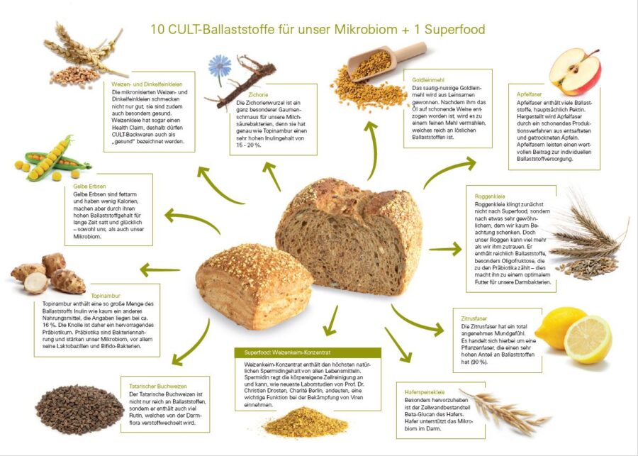 CULT-Backwaren sind “Superfood aus der Bäckerei”: Reich an Ballaststoffen aus Getreide, Gemüse und Obst sind sie ideales Futter für unser Mikrobiom.