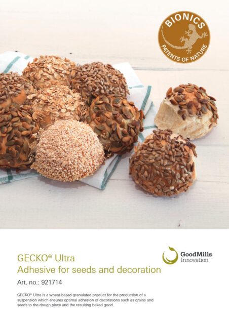 Seed adhesive which makes seeds adhere strongly to baked goods. Raw materials are subjected to a special refining process which activates the adhesive properties of the grain.